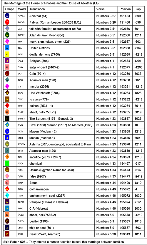 Not only was there a Bible Code on it, the code indicated that this was literally the marriage from Sheol (hell). Likely the groom was a son of Fabius and the bride, a daughter of Abiathar. Any child of this union would still be considered Jewish because it is motherhood that determines whether someone is Jewish or not. Never mind that there would be a stain on the line of Aaron with every Phiabi-created priest. We also learn very quickly that everything evil became part of this wedding. Clearly, this was an insidious plan to corrupt the priesthood of the LORD.